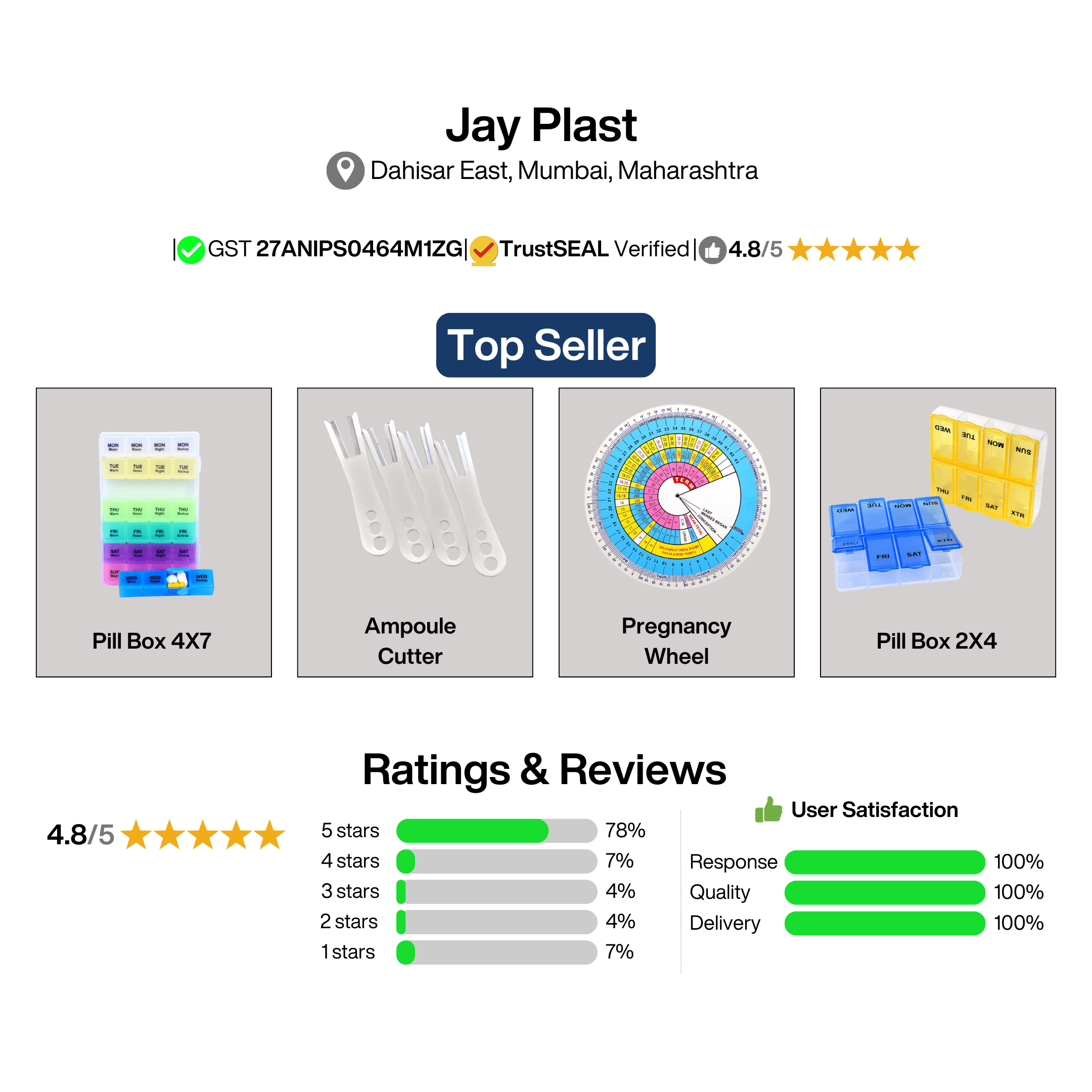 Jay Plast has built a strong online presence with over 10,000 positive reviews. Our pill box stands out as a top-rated product, earning dominant responses from both customers and clients in the pharmacy and corporate gifting sectors.